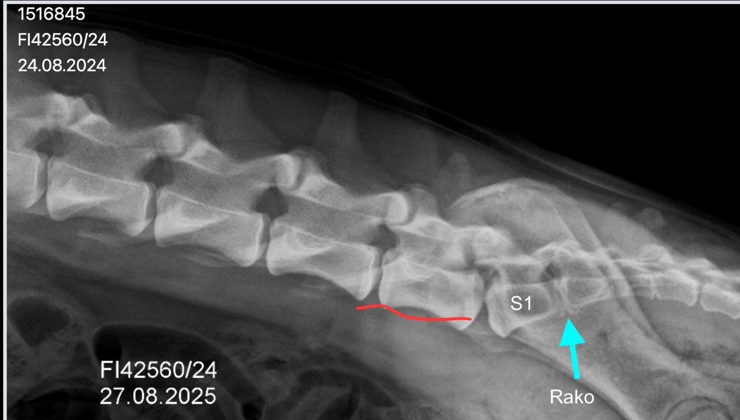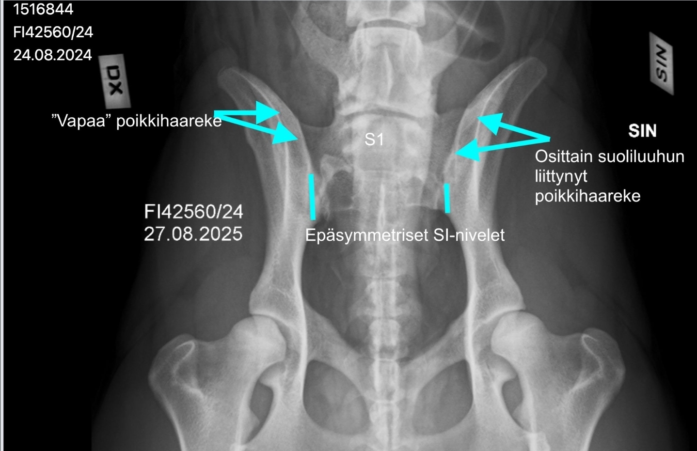 Koiran ensimmäinen ristinikama S1 on epäsymmetrinen ristinikaman ja lannenikaman välimuoto. Se on irti toisesta ristinikamasta ja siinä on epäsymmetrinen poikkihaarakkeet, joista toinen on "vapaa" ja toinen on osittain yhdistynyt suoliluuhun. Lisäksi koiran risti-suoliluunivelet (Sl-nivelet) ovat epäsymmetriset.