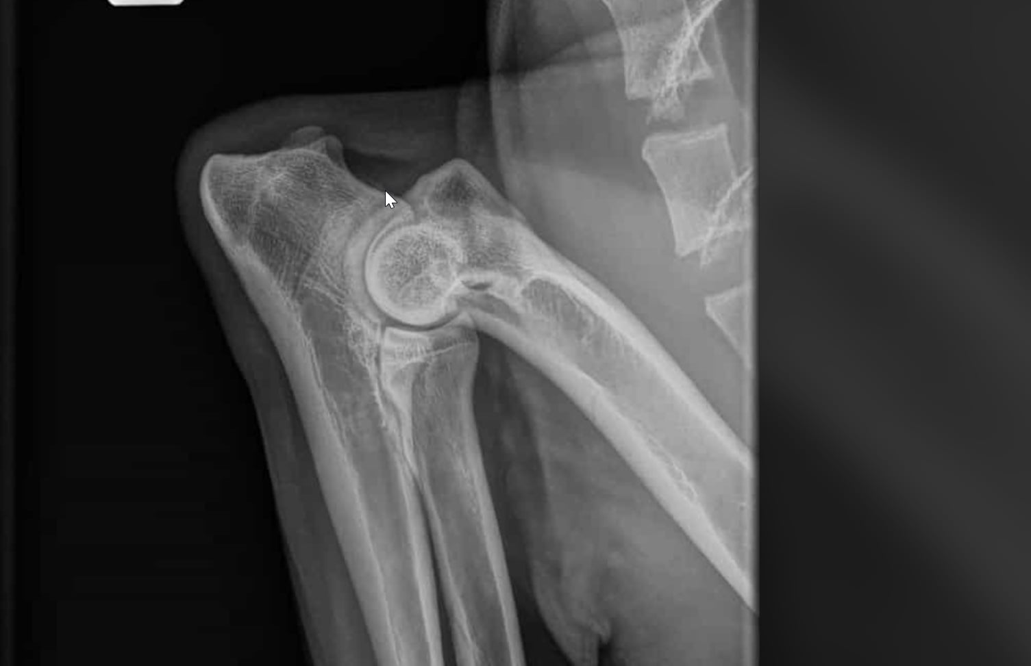 hiiren osoittimesta vasemmalle/ylös lähtee osteofyytti luun pinnassa, joka ei mikään koiran kannalta iso. Todennäköisesti seurausta kasvuaikana olleesta pienestä inkongroensista ja nivel päässyt liikkumaan liikaa.