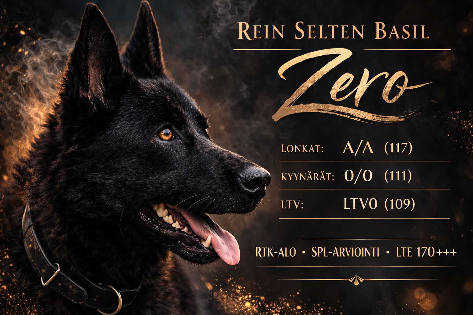 Zero asustelee kotona ja vaikka ei olekkaan eläkeikäinen, se ei ole mitenkään aktiivisesti harrastuskäytössä. Zero on ollut pl. korvatulehdusta ( ja sen seurauksena ollutta verikorvaa) ikänsä terve. Kiihtyy voimakkaasti ja omaa kovan turhauman, selvästi puolustusalueen koira.